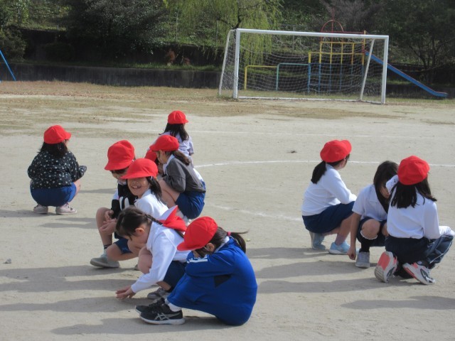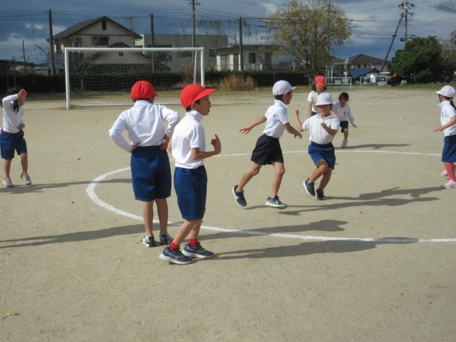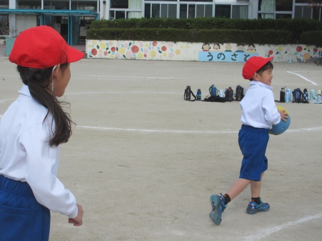 ボールゲームをしました。円の中で、動いてボールに当たらないように、ボールを投げて当たるように・・・楽しみながら運動になっています。