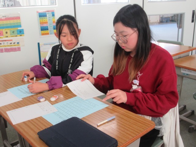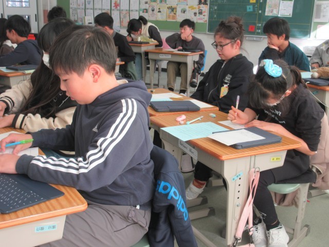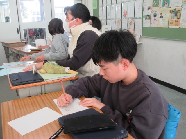 テストが終わった後、手紙や標語に取り組みました。12月には、人権週間や感謝の会があります。人権は作品募集の標語、感謝の会は渡す手紙を書きました。
