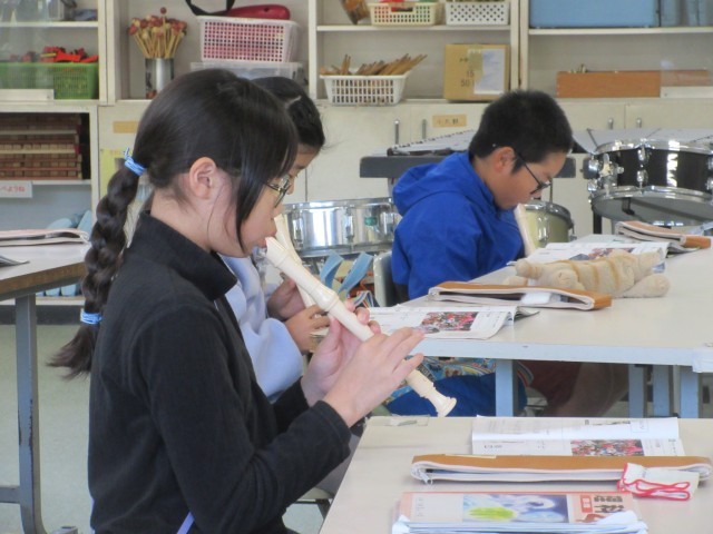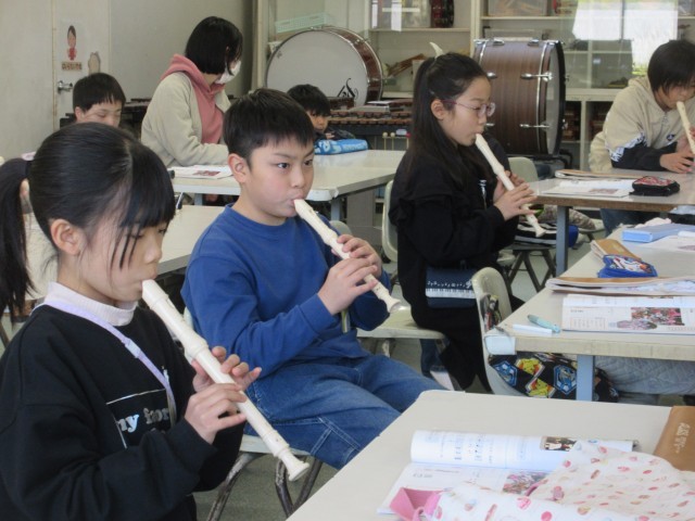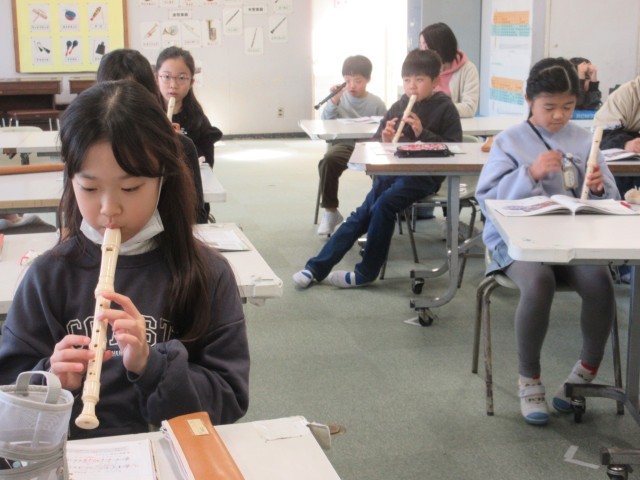 リコーダーで、「朝の歌 チェロキー・モーニング・ソング」という曲を練習しました。この歌は、北アメリカのチェロキー族に伝わる歌だそうです。低い「ド」の音を出す練習をしました。