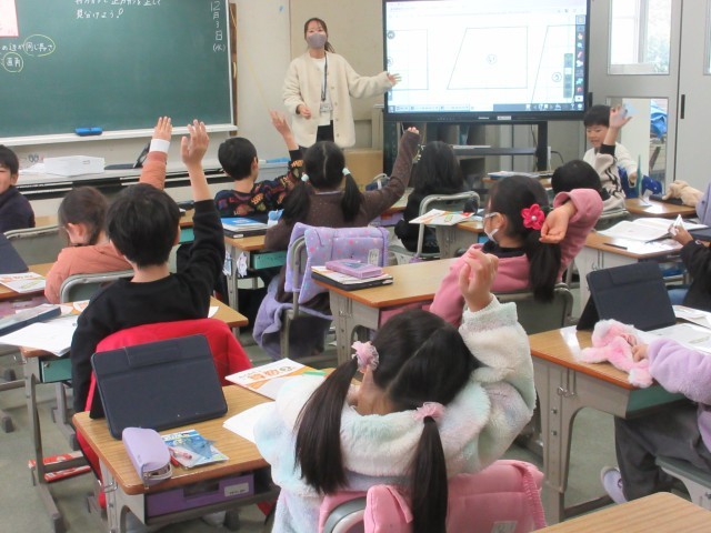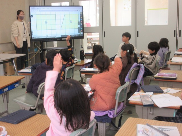 三角形と四角形・・・三角定規も使う学習です。手を挙げて発言する場面がたくさんありました。