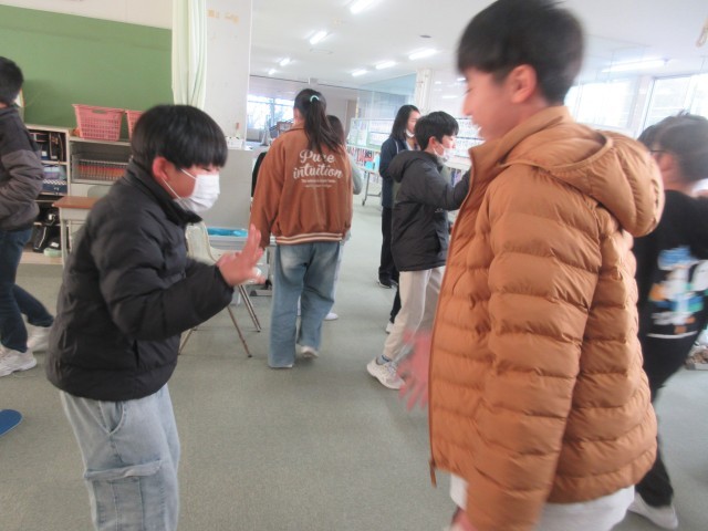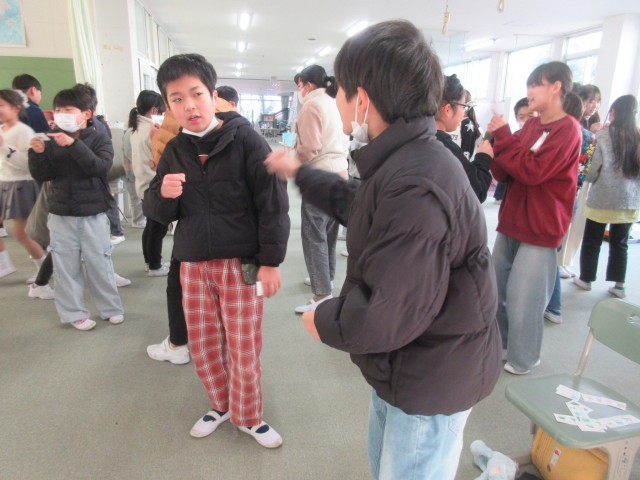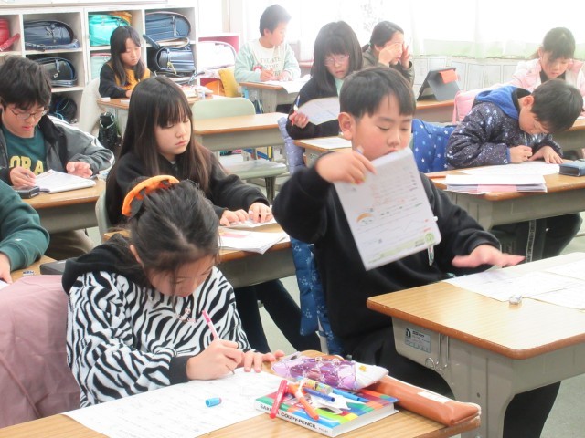 1組と2組の合同で、外国語の授業。動物が住んでいるところのカードを使って、ゲームをしました。盛り上がりました。