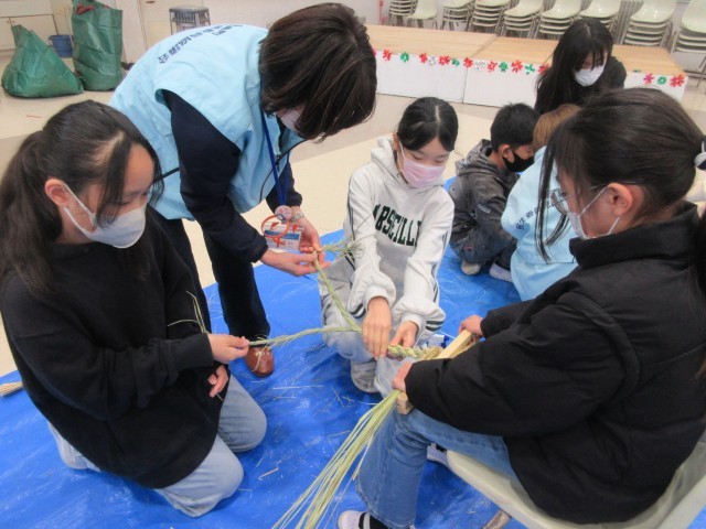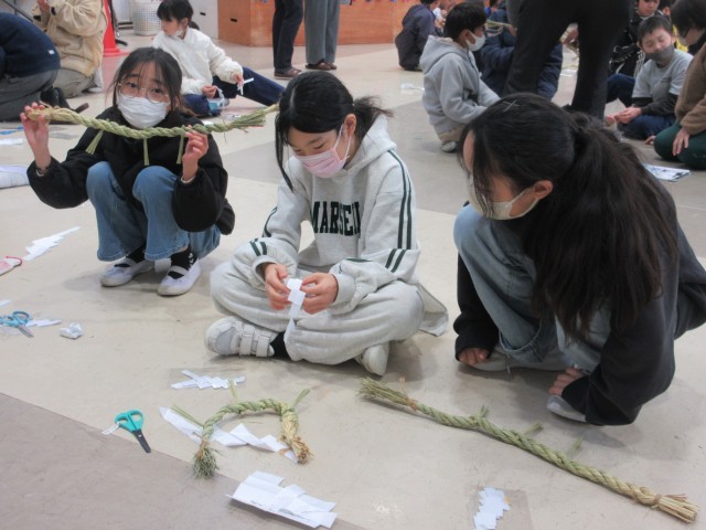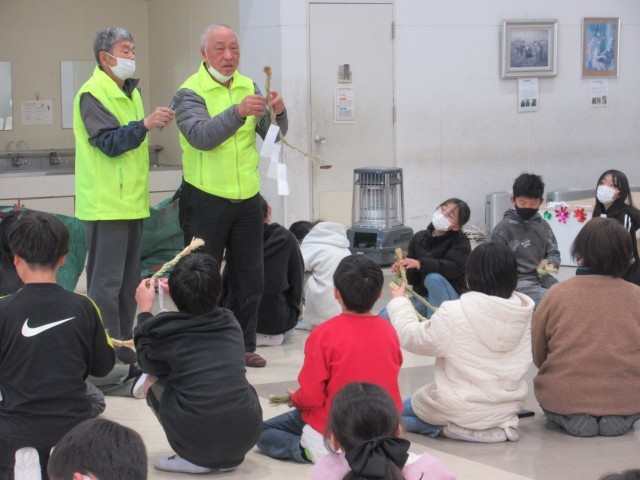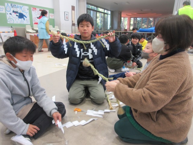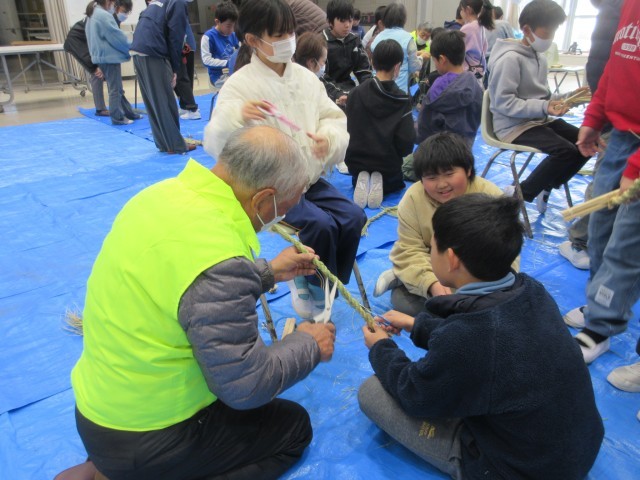コミュティ会長、民生・児童委員、見守り隊の方など、地域の方に来ていただき、しめ縄づくりをしました。3人1組で、協力し合って縄をつくりました。「米」をテーマにしてきた学習のまとめです。縄づくりを通して、日本の文化や伝統を知る機会になりました。講師として来校してくださった地域のみなさん、ありがとうございました。