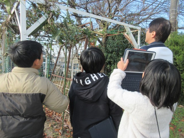 冬と生き物・・・冬になると、植物や動物に何か変化があるかな。タブレットで写真を撮り、理科ノートの観察記録をかきました。