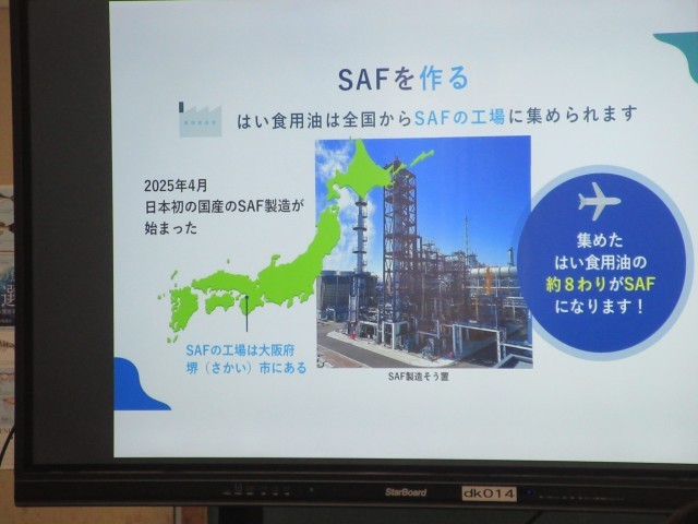 セントレアのサスティナビリティ推進室の方が来校し、SAFの出前授業をしていただきました。SAFは持続可能な航空燃料「Sastainable Aviation Fuel」の略称で、配食用油や植物、都市ゴミなどを原料とし、従来のジェット燃料と比較してCO2(二酸化炭素)ぼ排出量を大幅に削減できる航空燃料です。使い終わった食用油で、飛行機が飛ぶ!・・・未来につながっていく取組です。講師の方から、「6年生が『「東浦町では、どこで食用油を集めていますか』」などよい質問をしてくれて、うれしい気持ちになりました」とおっしゃっていました。6年生は、関心をもって話を聞くことができました。