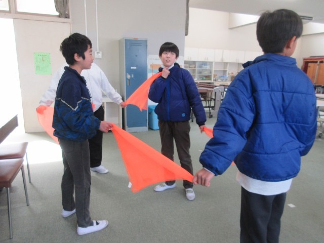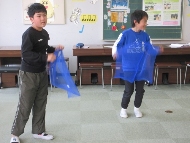 「つるぎのまい」の鑑賞をしました。音楽に合う動きを考えて、布を持って体を動かしました。「つるぎのまい」は、「聞いたことがある」と思った子もいました。