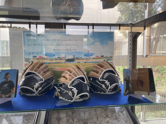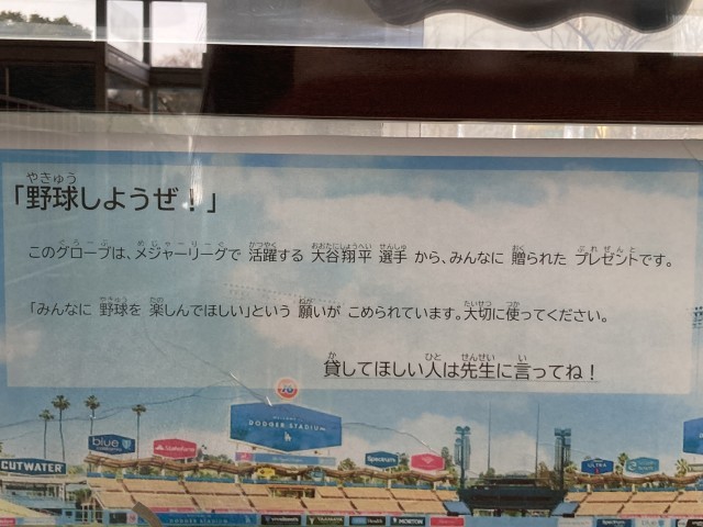 今年のメジャーリーグが始まりました。大谷翔平選手をはじめ,日本人選手の活躍が楽しみです。令和5年12月にメジャーリーガーの大谷翔平選手からグローブが寄贈され、たくさんのうのさとっ子に見てもらったりキャッチボールをしてもらったりしました。また見てもらえるように、低学年昇降口の鍵付きガラスケースに展示をしました。新学期になったら、また見てくださいね。新しい1年生にも見てもらいたいです。もちろん、先生に言えば貸してもらえます!