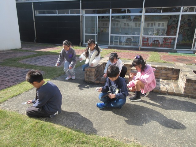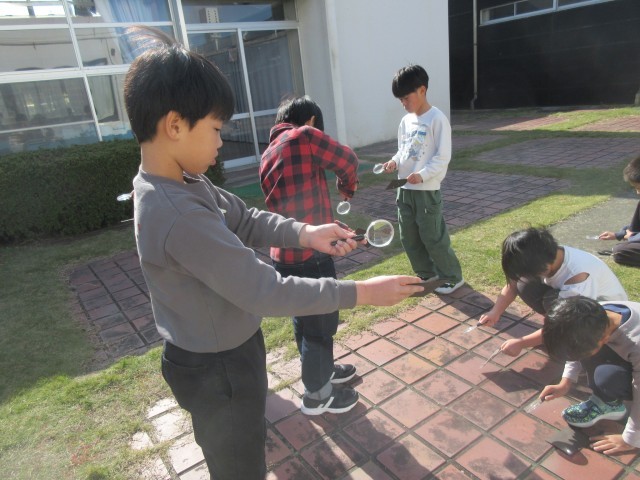理科では、光の学習をしています。今日は虫めがねで日光を集める実験をしました。みんな真剣でした。