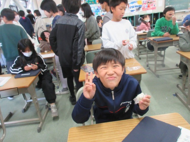 5年生からおにぎりのプレゼントがありました。5年生が4月から一生懸命作ったお米でおにぎりを作ってくれました。とてもおいしかったです。