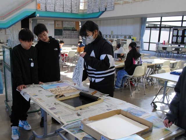 6年生は、図工「版で広がるわたしの思い」の学習に取り組んでいます。版が彫り終わった児童から印刷、着色を始めました。