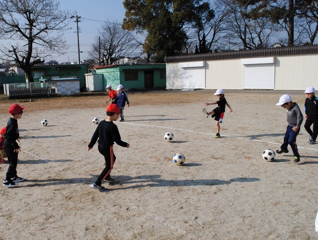 1年生は、体育「ゲーム(ボールゲーム)ボール蹴りゲーム」の学習をしています。ボールを相手に向かって蹴ってパスをする練習をしました。