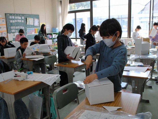 4年生は、図工「おもしろだんボールボックス」の学習をしています。段ボールの形を活かして自分だけの入れ物を作っています。