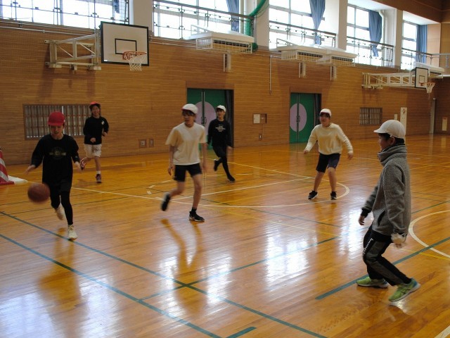 5年生は、体育「ボール運動(ゴール型)バスケットボール」の学習をしています。試合形式で、パスをつないでゴールにつなげる練習をしました。