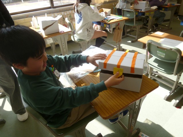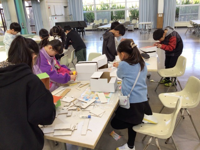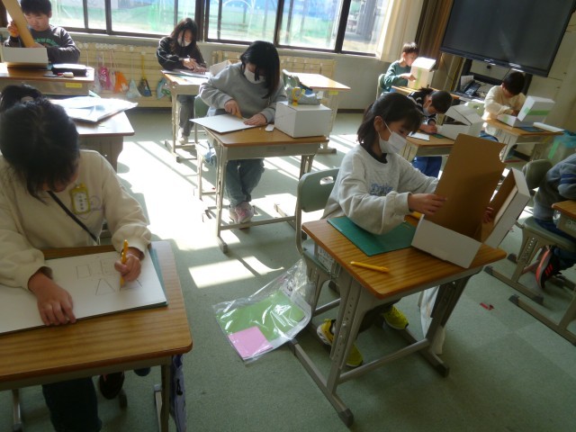 図工で「おもしろダンボールボックス」に取り組んでいます。直方体を切って、できた形から入れ物を作っています。こんな入れ物にしたいと一人ひとり思いをもって活動しています。