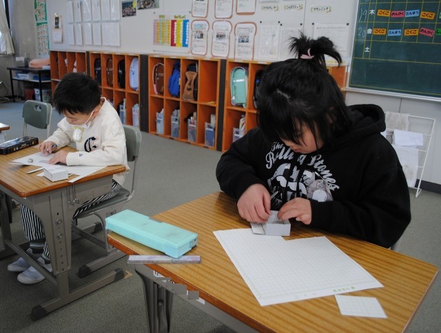2年生は、算数「はこの形」の学習をしています。工作用紙を使って、箱の形を作ってみました。