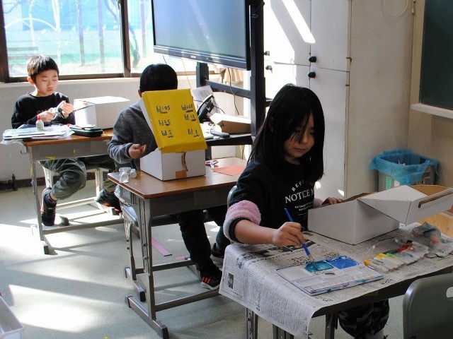 4年生は、図工「おもしろダンボールボックス」の学習をしています。作品が完成に近づき、色を塗ったり飾りをつけたりしました。