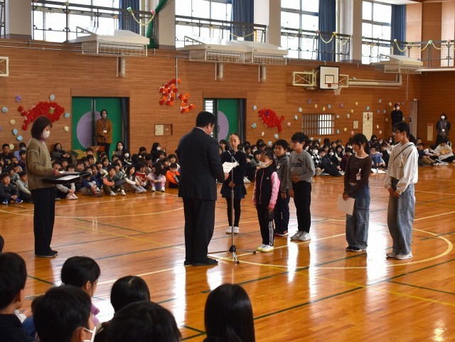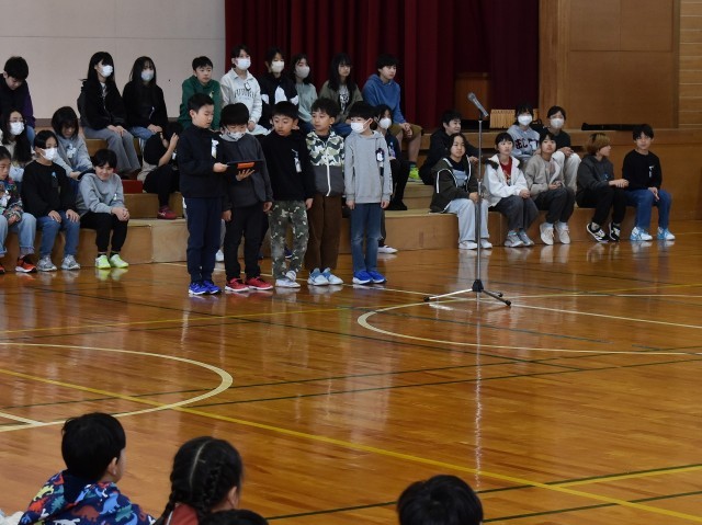 体育館で朝のつどいを行いました。明日の「6年生ありがとうの会」の隊形で行ったため、6年生が正面に座りました。