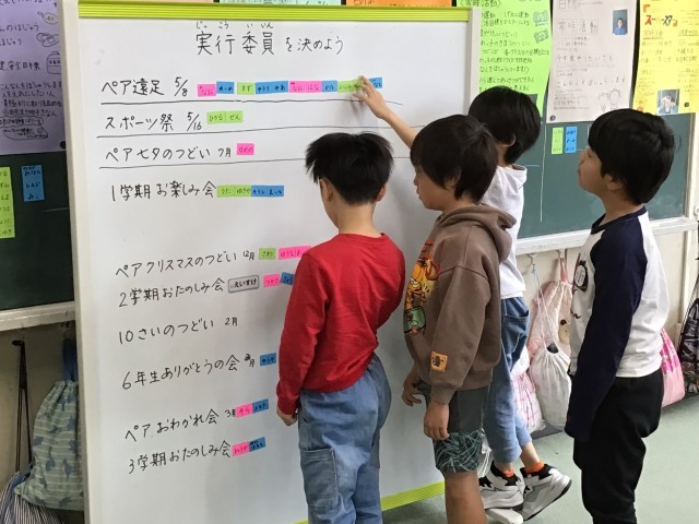 今週は4年生の「生きる」のテーマを決めたり、4年生から新たに始まる実行委員・自治をみんなで決めました。