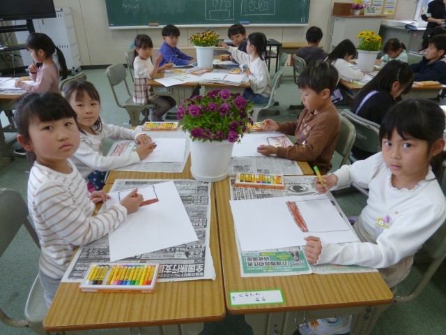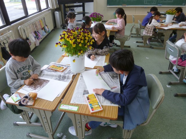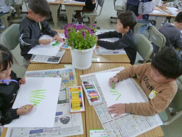 春の花「パンジー」を描きました。どの子も花や葉の形や色よく見て、色を塗っていました。