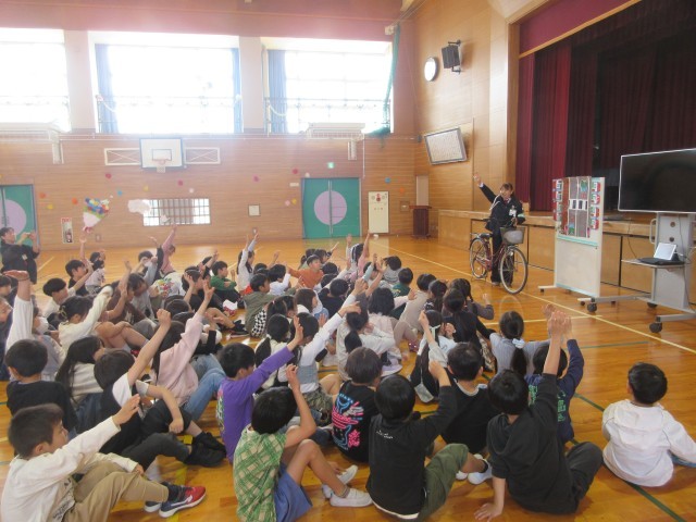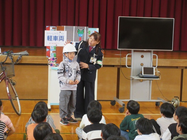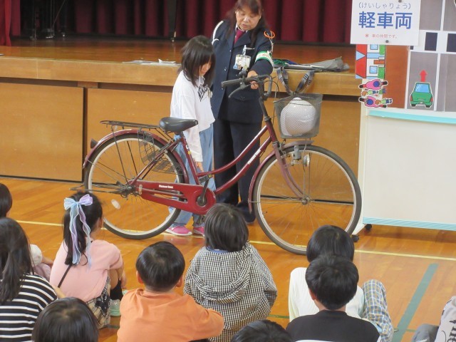 交通教室がありました。指導員さんに、ヘルメットのかぶり方、自転車に乗るときのルールなどを教えていただきました。安全に気をつけて自転車に乗りましょう。