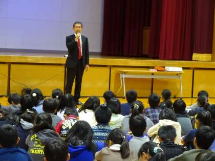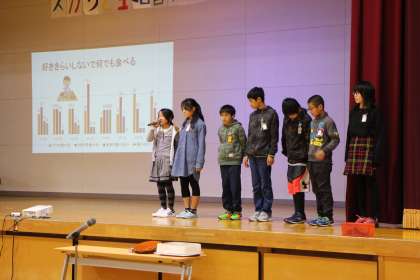 今回のテーマは,「スカッと生活習慣病教育〜あなたの行動で未来が変わる〜」です。保健の自治による生活調査の結果発表と食物に関するクイズを行いました。栄養教諭からは「自分でできる病気の予防」についてお話がありました。代表児童が,だしの使い方で塩分を控えられること味見をして実感しました。