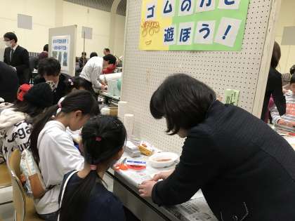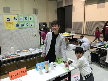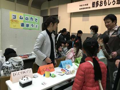 知多おもしろ理科実験教室が知多市勤労文化会館で開催されました。本校教員も「ゴムの力で遊ぼう!」のブースを開きました。おがわっ子も来場していました。