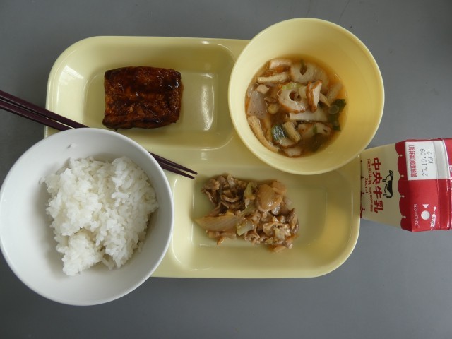 今日のメニューは、けんちん篠田の甘味噌かけ、焼き肉風炒め、のっぺい汁等です。
