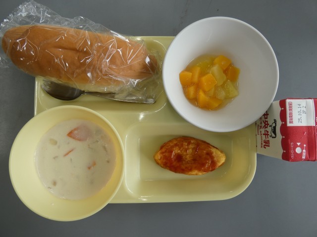 今日のメニューは、ミルクロールパン、オムレツのケチャップソースかけ、里いものクリームシチュー、アップルポンチ等です。