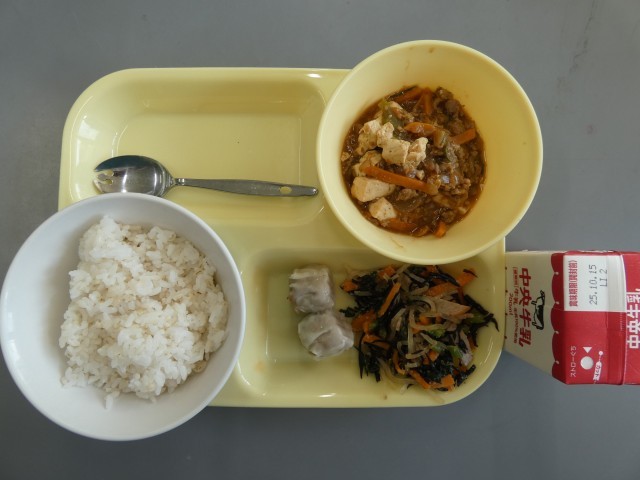 今日のメニューは、シュウマイ、麻婆豆腐、ひじきと春雨の胡麻酢和え等です。