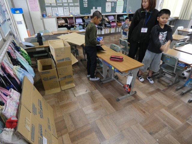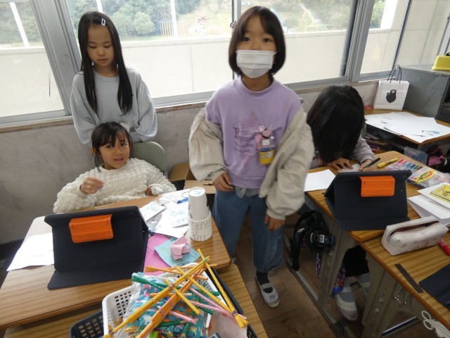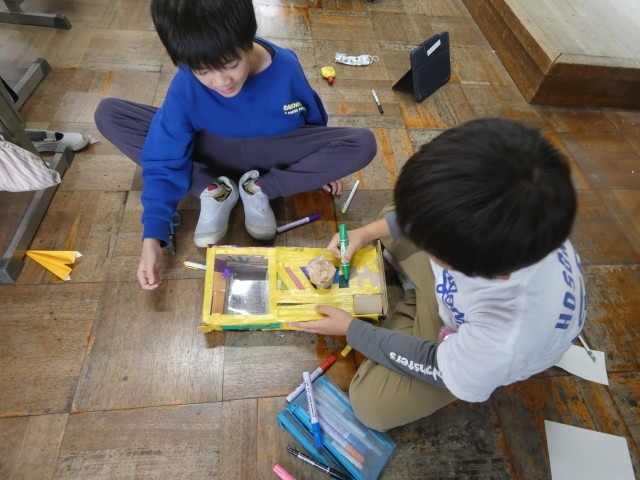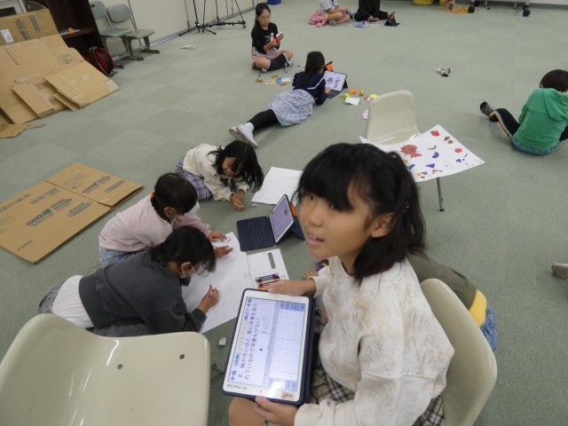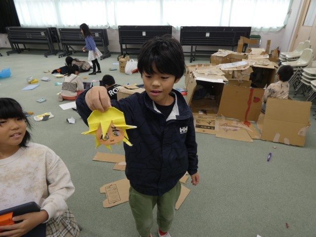 細かな細工物を作っている人もいれば、段ボールでトンネルのような物を作っている人たちもいます。何ができるのでしょうか。