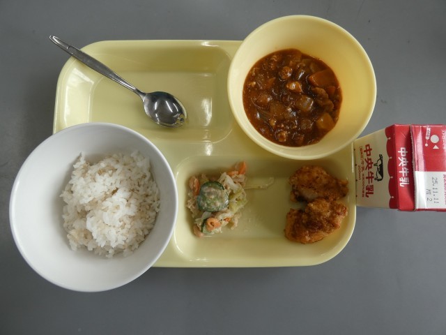 今日のメニューは、麦ご飯、米粉ハヤシライス、スパイシーチキン、インゲン豆のサラダなどです。