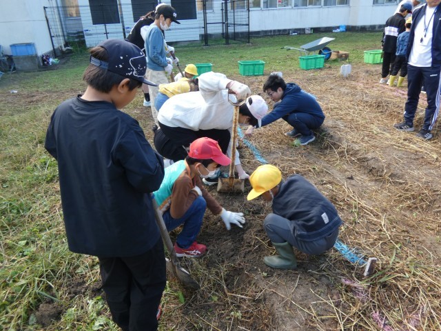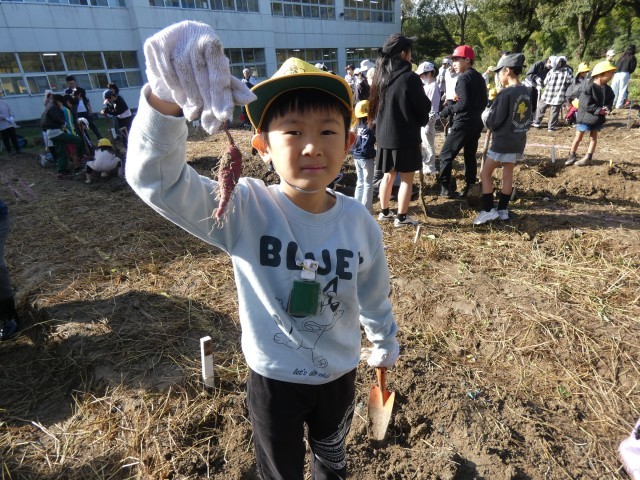 1時間目は、1、6年のペアです。決められた場所を掘ってみましたが、掘れども掘れども根っこしか出てきませんでした。収穫は0個でした。