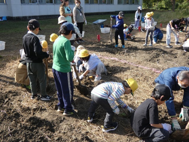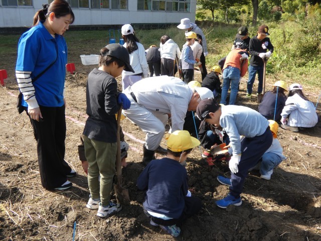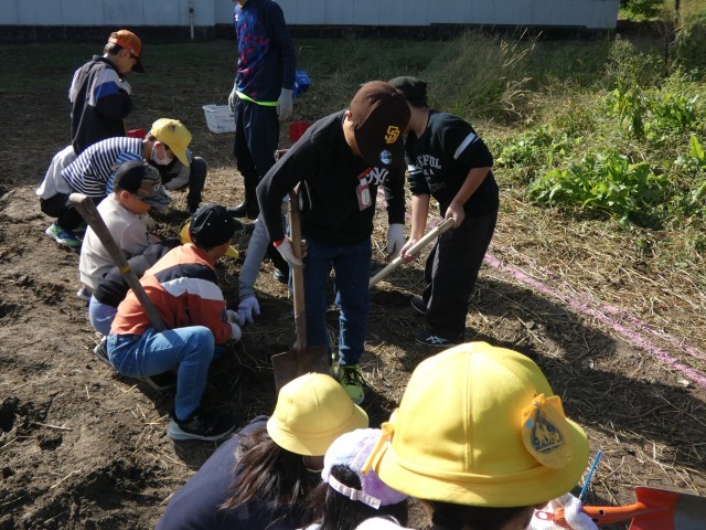 今日は、待ちに待ったサツマイモ収穫の日です。苗の植え付けにもご協力いただいた地域の方(喜生会)をお呼びして、意気込んでイモ掘りを行いました。