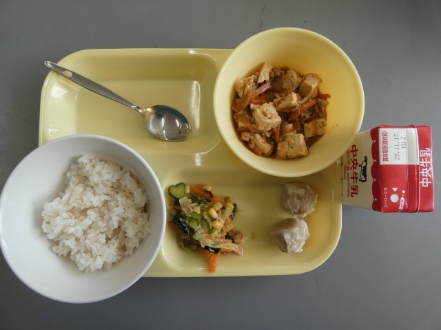 今日のメニューは、麦ご飯、麻婆豆腐、シュウマイ、海藻サラダなどです。