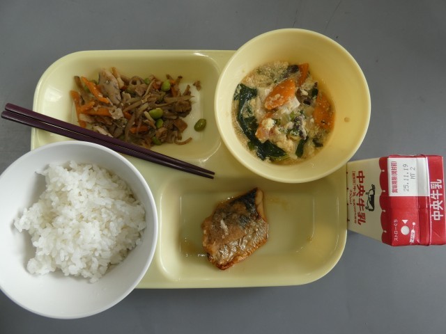 今日のメニューは、焼き鯖のみぞれかけ、五目きんぴら、かき玉汁等です。