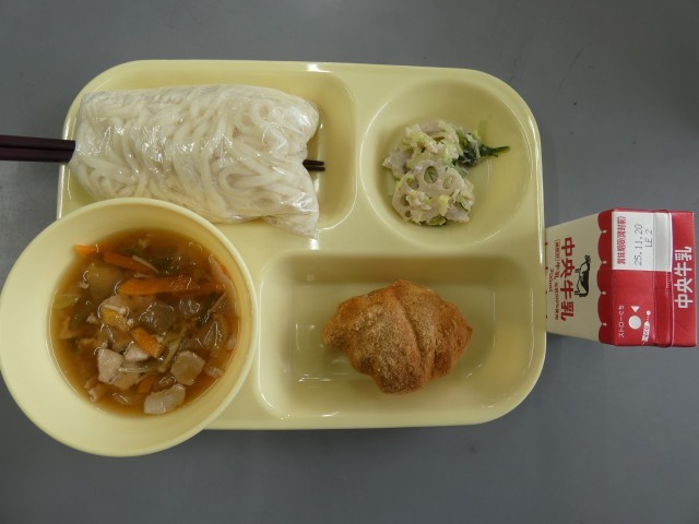 今日のメニューは、白玉うどん、肉うどんの汁、レンコンと水菜のサラダ、きなこ揚げパン等です。
