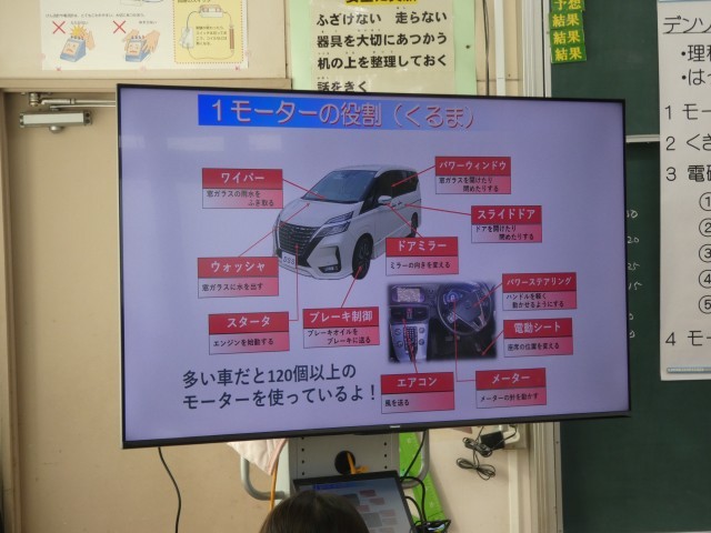 モーターは電気エネルギーを機械エネルギーにする機器のことですが、ちょうど今、授業では「電流が生み出す力」を進めていますので、ひっ゜たりの内容でした。