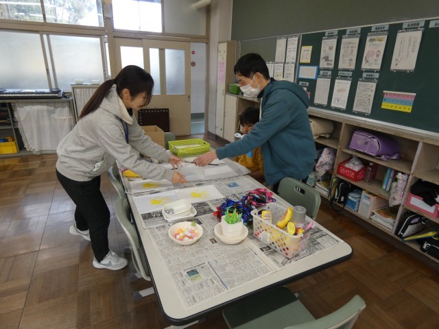 手のひらに絵の具をのせて、手形ハンコにするようです。手形には、何やらひげや目のようなものもついていますが・・・何ができるか楽しみですね。