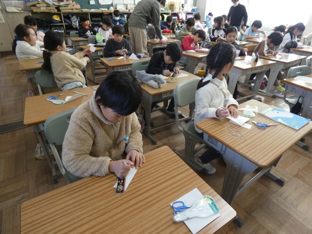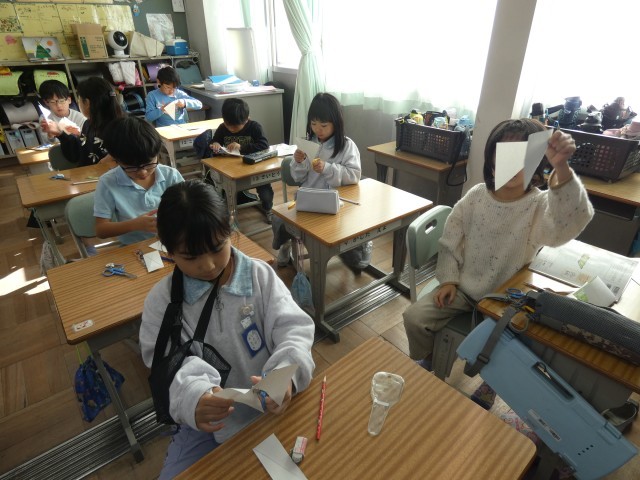 今日は四角形の向かい合う頂点の間に線を引いて、はさみで切るとどのような形ができあがるかを確かめています。