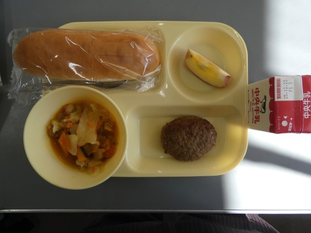 今日のメニューは、ミルクロールパン、ハンバーグのバーベキューソースかけ、野菜のスープ煮、リンゴ等です。