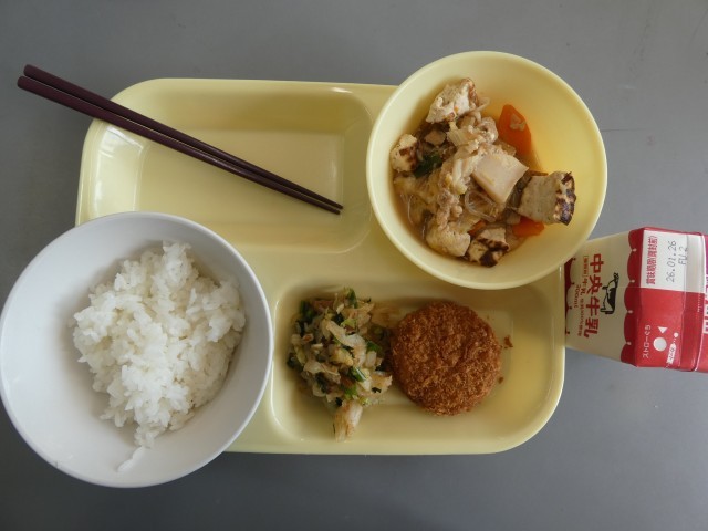今日のメニューは、和風コロッケ、野菜のおかか和え、ひきずり等です。