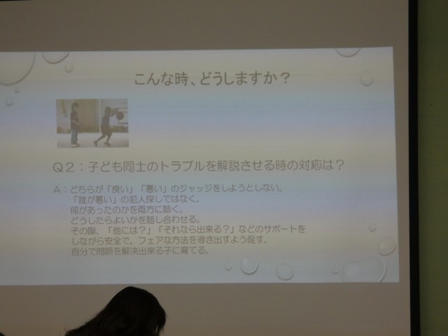 の3点で話していただきました。子どもたちとのよりよい関わり方について、具体的な例を挙げて話していただきました。