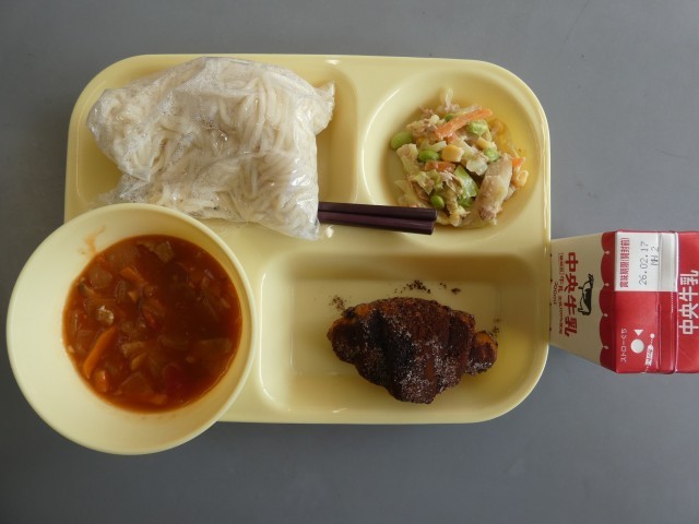 今日のメニューは、ソフト面、トマトソース、ツナサラダ、ココア揚げパン等です。
