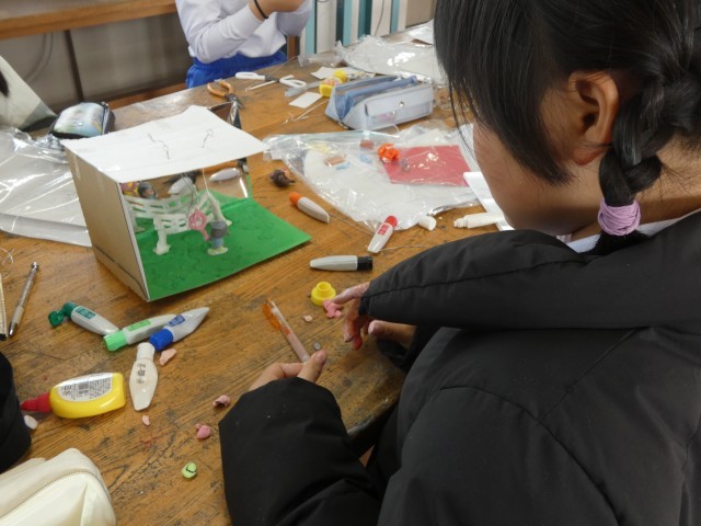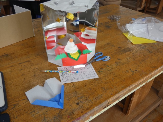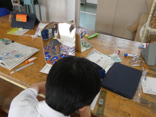 図画工作科「ミラーワールド」が完成しました。みな、それぞれの工夫した点やアピールポイントを個票にしたためていますね。