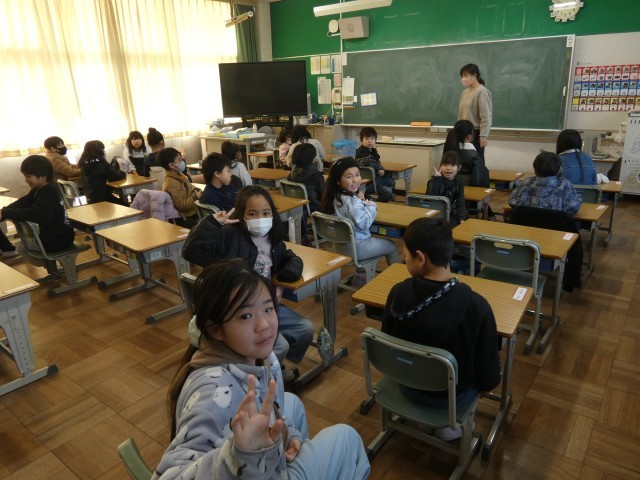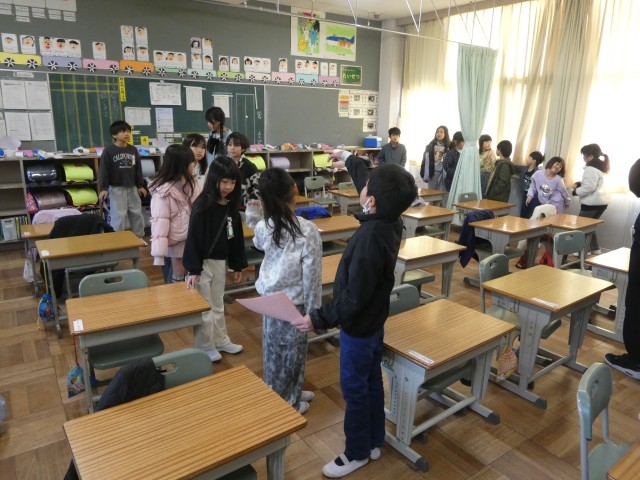 新しい班長さんが決まり、登校時の並び方の確認をしました。また、新1年生が入ってくる班の班長さんには、新1年生に渡す「入学おめでとうカード」が配られました。新1年生に届けてください。