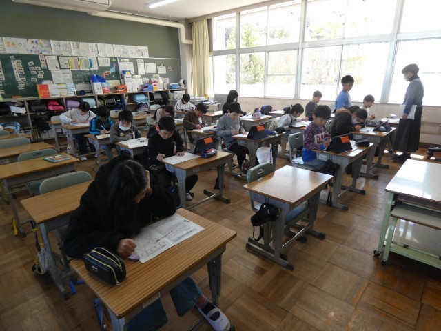 チャレンジプリントが廊下のボックスに入っており、子どもたちは各自の進度で問題に取り組んでいます。