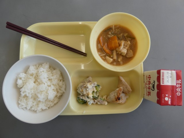 今日のメニューは、鶏肉の塩麹焼き、卯の花サラダ、豚汁等です。