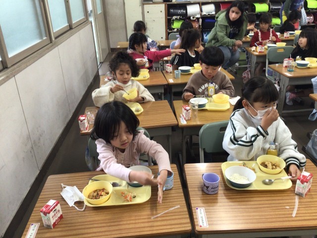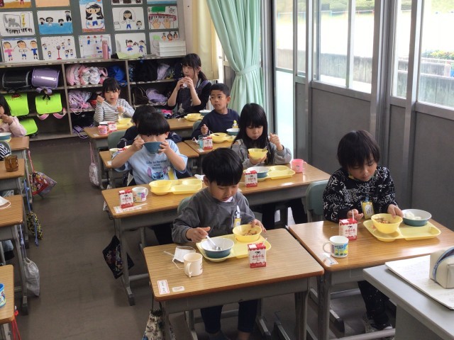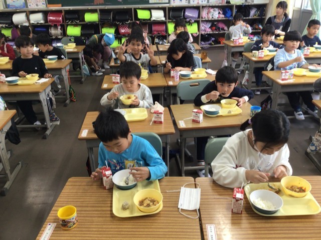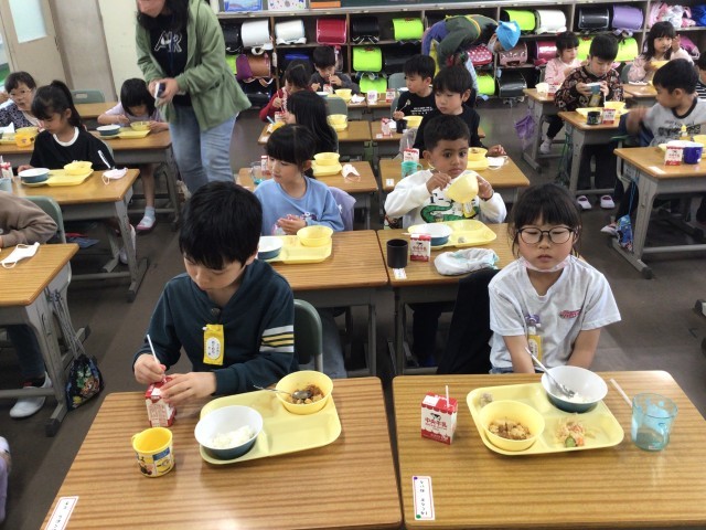 知多半島のトップを切って(多分)、1年生から6年生までそろって給食が始まりました。特に、入学したての1年生の支度は大変でしたが、担任をはじめとしてたくさんの大人の協力を得て、食べ始めることができました。麻婆豆腐、美味しかったですね。早く自分たちで支度ができるようになりましょう!