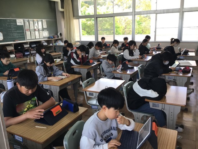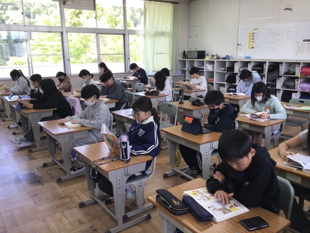 1時間目の体育に向けて着替えているクラスもありましたが、静かに読書をしていました。「よむらび電子図書」も活用していきます。