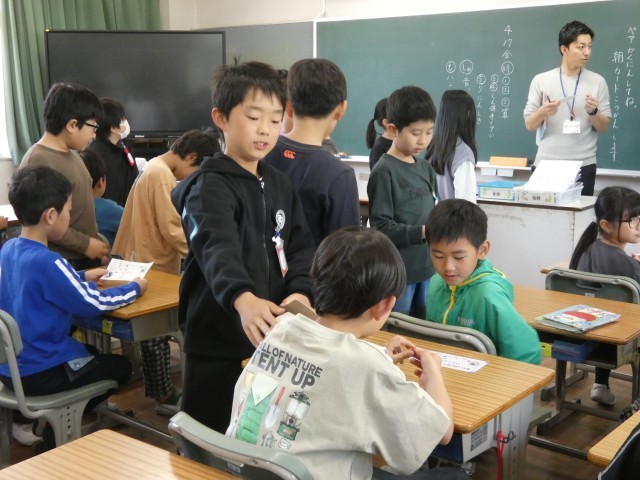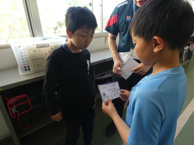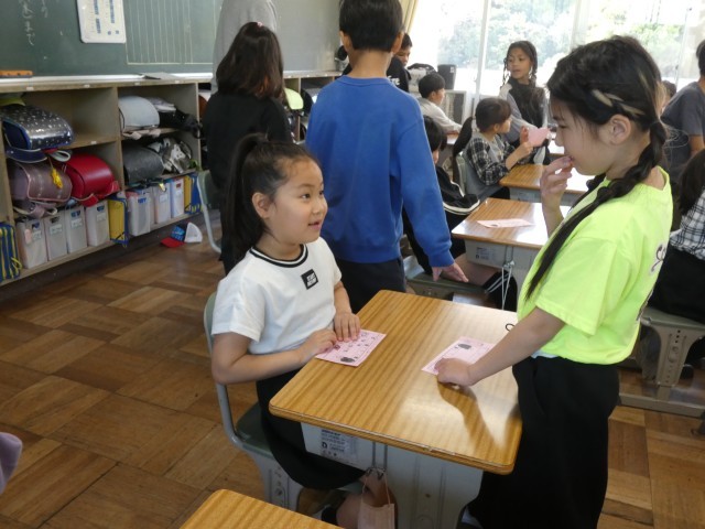 今日は3・5年生がペアカードを交換していました。