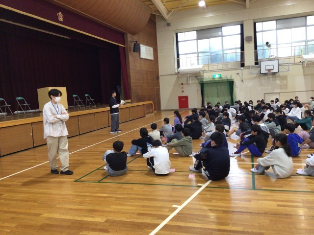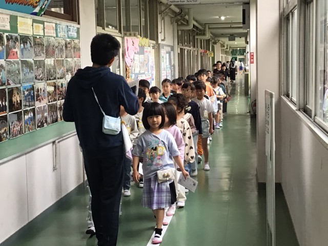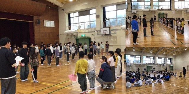 ペア活動のスタートとして、カード交換をしました。それぞれ教室から体育館に向かい、合流しました。5歳の歳の差がある1・6年間ペアは、小学校ならではですね。
